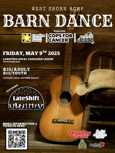 —May 9th Friday Cops For Cancer Tour de Rock! Fundraiser Dinner/Dance at Langford Legion. A great evening featuring a BBQ dinner, live music, dancing, prizes, family fun activities, a silent auction and more. Check the QR code below for tickets and more info. link